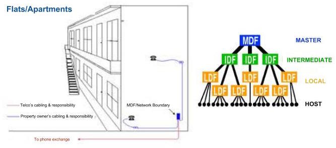 A Main Distribution frame (MDF or main frame) is a signal distribution point for connecting equipment inside a building to cables and equipment outside the building. Basically it is a termination point for incoming phone cable to connect to. The MDF is a termination point from the local exchange where exchange equipment and terminations are connected by jumper wires at the MDF. All copper cable pairs supplying services through telephone lines are then terminated at the MDF and distributed through the MDF to equipment inside the building from the local exchange. Like other Main Distribution frames, the MDF provides flexibility in assigning facilities at lower cost and higher capacity than a patch panel.